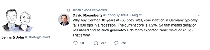 - Potential for generating ‘positive’ real yields — depending on how far inflation will fall versus where it is currently, you can still generate a positive real yield. We retweeted an interesting note on this on 21 August on why buy a German 10-year bond at -0.6%.