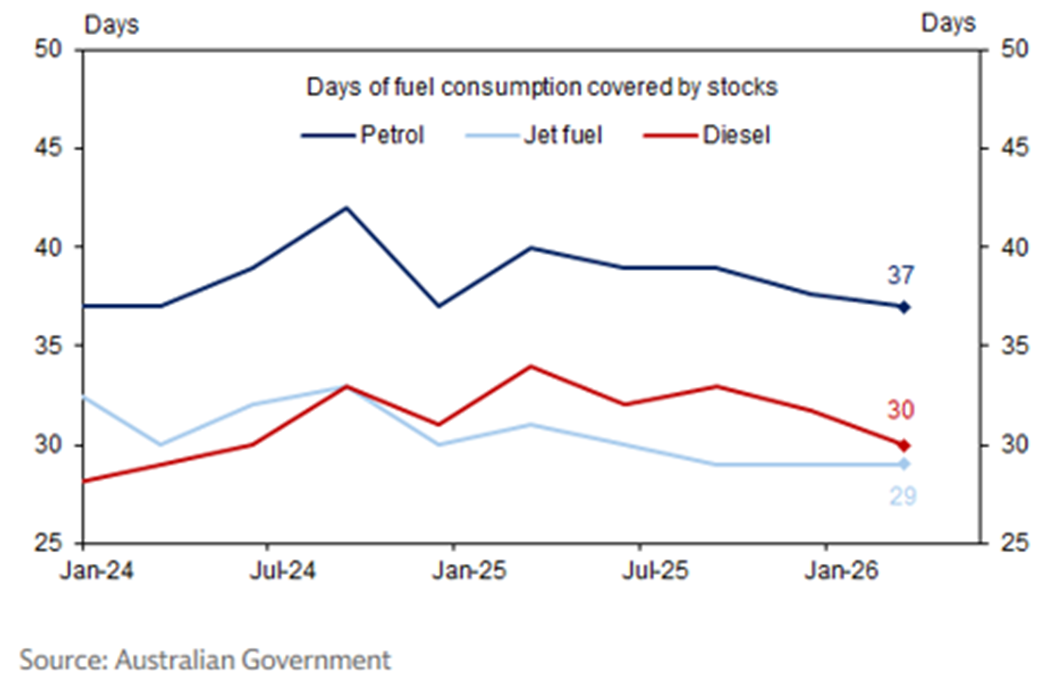 As at 10 March 2026, Australia held approximately 37 days of petrol, 29 days of jet fuel and 30 days of diesel, well below international benchmarks of 90 days.
