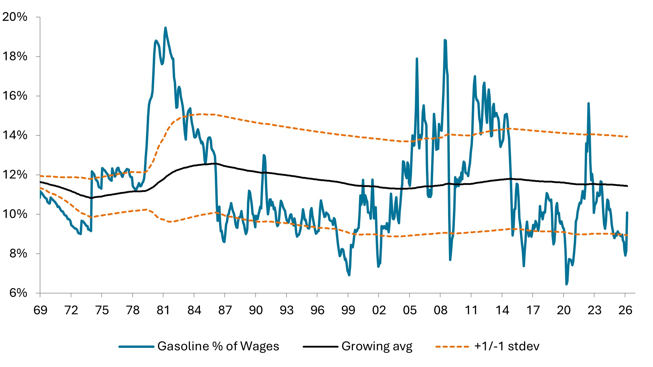 Source: RBA/JHI, US EIA, BLS, as at April 2026. Nominal data, U.S. All Grades All Formulations Retail Gasoline Prices (Dollars per Gallon), US Avg Hourly Earnings Production and Nonsupervisory Nonfarm Payrolls Total NSA. stdev= standard deviation.