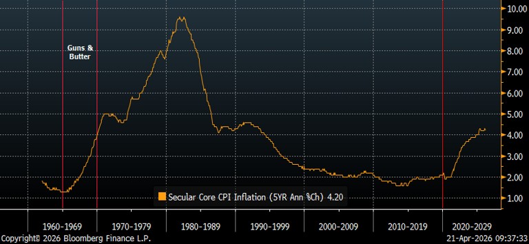 Chart 2 shows the secular trend in the Core Consumer Prices Index (CPI). The inflation trend of the last five years does appear to be mimicking that of the Guns & Butter period.