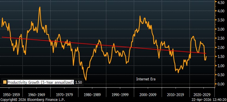 Some economists and investors suggest inflation concerns like ours are unfounded because artificial intelligence (AI) will produce massive improvements in productivity that will negate deglobalization’s inflationary pressures. That could be true but, believe it or not, there is scant historical evidence that technological innovation structurally improves US productivity.