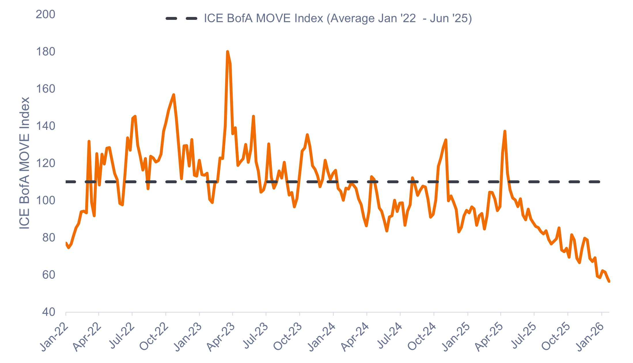 With inflation continuing to ease and the Fed maintaining a more dovish stance, we think lower rate volatility is likely to persist in 2026.