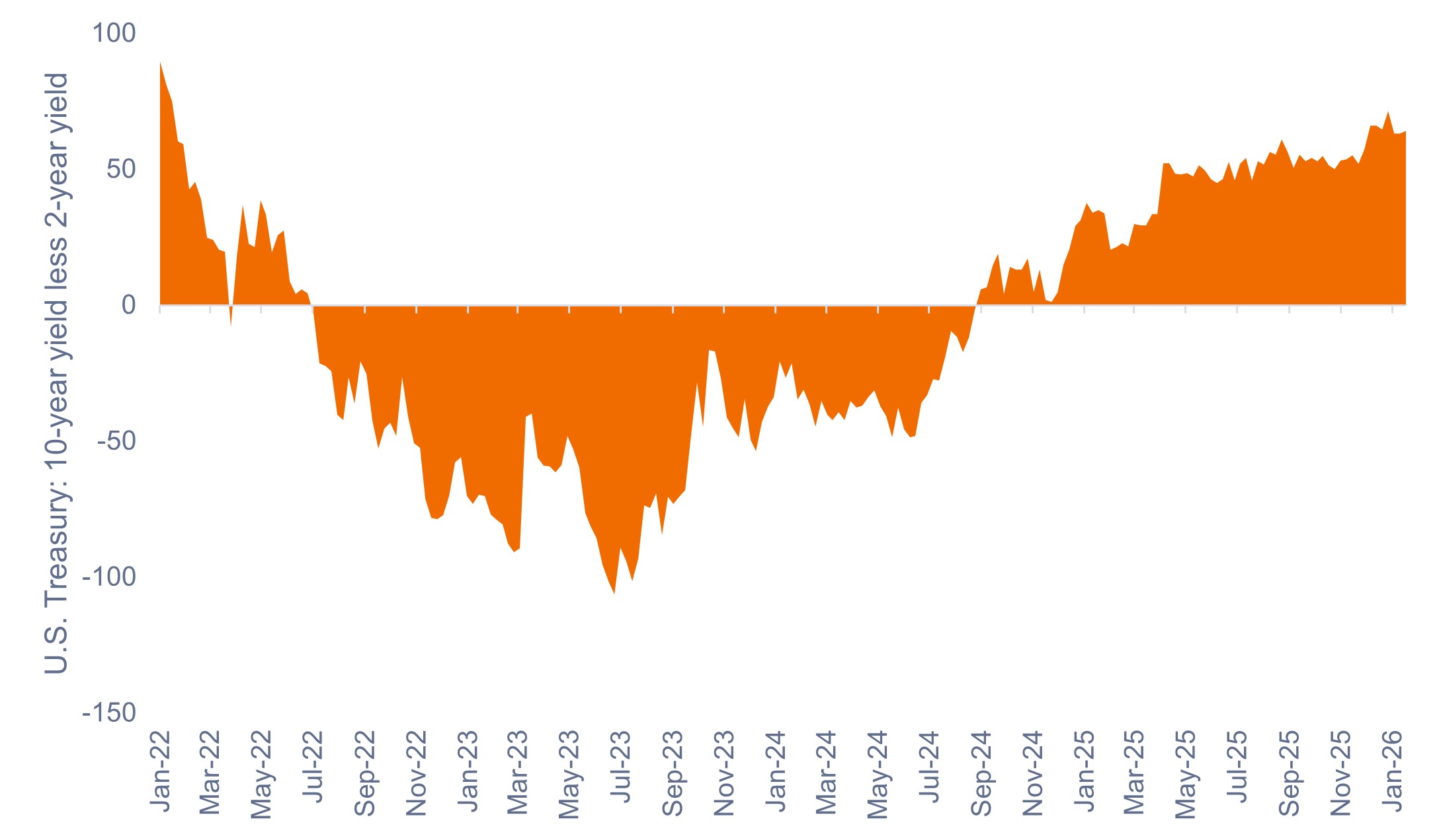 Exhibit 2: U.S. Treasury 10-year / 2-year yield spread (Jan 2022 – Jan 2026)