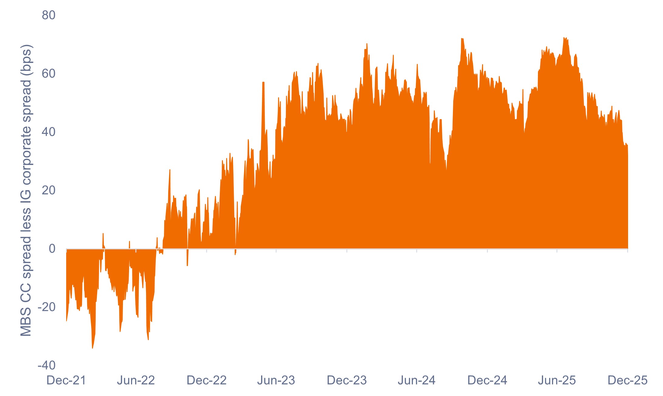 Exhibit 4: MBS current coupon (CC) spreads over investment-grade (IG) corporate spreads (Dec 2021 – Dec 2025)