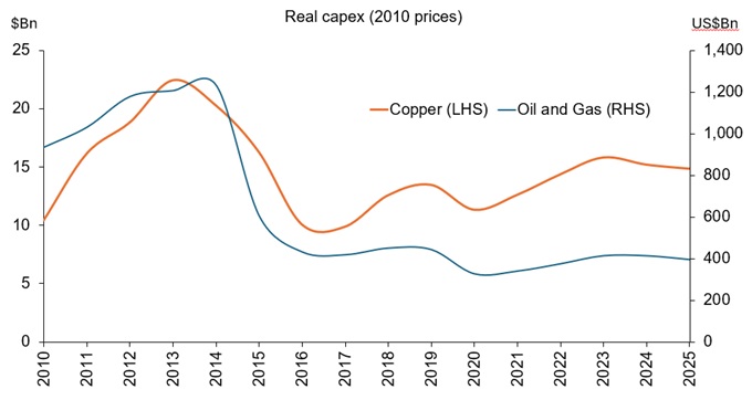 Source: Baker Hughes, Goldman Sachs (GS) Global Investment Research, IEA, 2010 to 2025. Chart shows copper (lhs) and oil & gas (rhs) and real capex in 2010 US dollars terms. For oil and gas, chart uses GS data from 2010 to 2015. Post 2015, it uses IEA data.