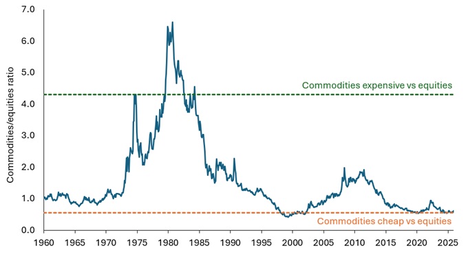 Source: Janus Henderson Investors, Bloomberg, using the Bloomberg Commodities Index and the Dow Jones industrial Average Index, February 1960 to January 2026. Past performance does not predict future returns.