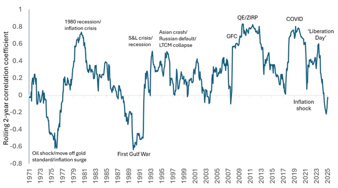 Source: Janus Henderson, Bloomberg, 31 December 1971 to 30 January 2026. Commodities/Equities correlation chart indices used: MSCI World Net Total Return USD Index & Bloomberg Commodity Index (BCOM).