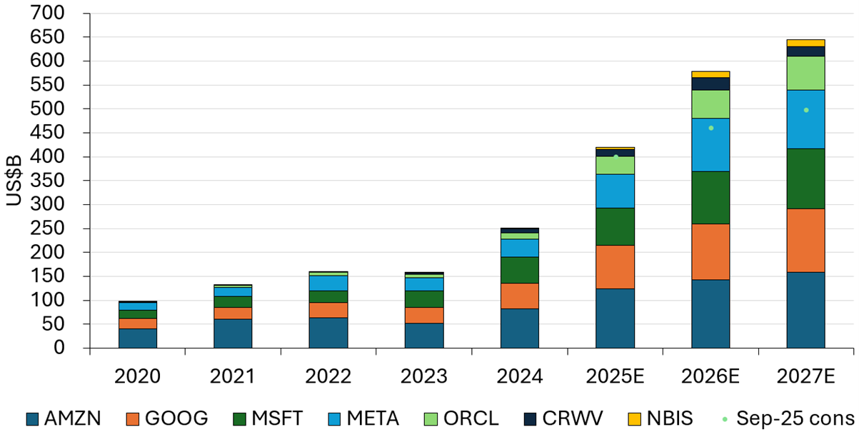 Before we talk about our outlook for the year ahead it is important to review how sustainable equities have fared. Artificial intelligence (AI) dominated stock market returns in 2025. Hyperscalers like Microsoft, Amazon, Alphabet and Meta committed over US$400bn to AI infrastructure, with total capital expenditure (capex) expected to reach US$600bn in 2026 (Figure 1). Companies exposed to this tsunami of capital – leading edge semiconductors, memory, networking, electrical equipment, power generation – delivered strong returns, leaving most other sectors languishing (with the exception of banks and defence).