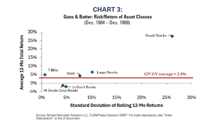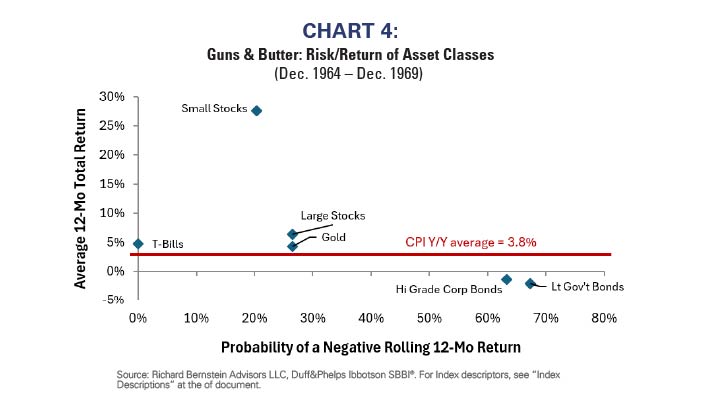 Traditional fixed income, such as Treasuries and investment-grade corporate credit, had negative absolute returns during the Guns & Butter period and real returns were negative (i.e., returns underperformed inflation).