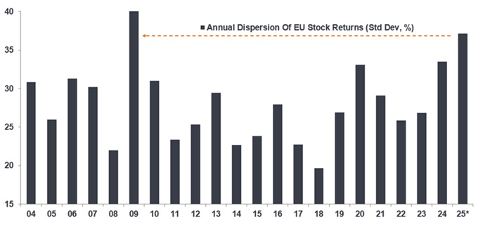 Source: FactSet, Morgan Stanley Alpha. * indicates the calendar-year dispersion for 2025 until 28th November 2025. Past performance does not predict future returns.