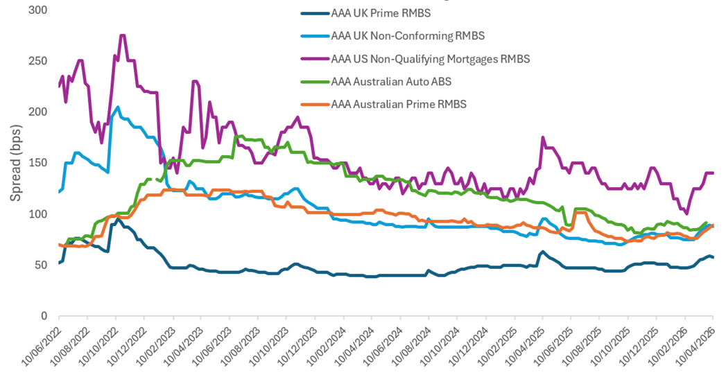 Source: JP Morgan, Pricing Direct Inc, Westpac, as at 10 April 2026. CMBS: Commercial Mortgage-backed Securities. RMBS: Residential Mortgage-backed Securities. US Non-Qualifying Mortgages: JP Morgan NQM A1 index data. The rest of the sectors are from JP Morgan analysis, where spreads do not reflect a particular bond or basket of bonds, but rather indicate observations of general secondary market movements on a week-to-week basis from JP Morgan’s European ABS secondary trading desk.