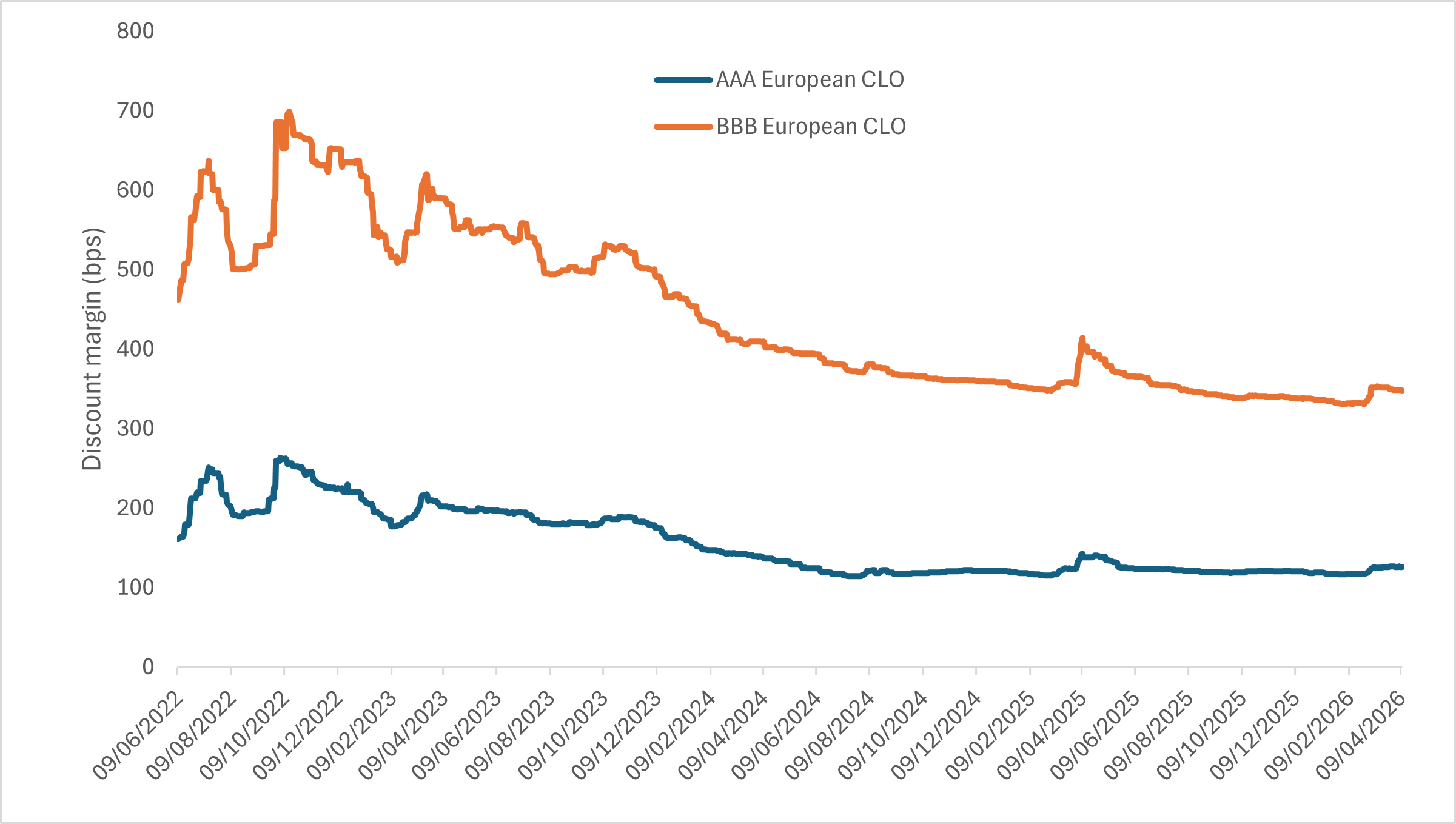 Source: JP Morgan, as at 10 April 2026. J.P. Morgan European Collateralized Loan Obligation BBB Index; J.P. Morgan European Collateralized Loan Obligation AAA Index. Past performance does not predict future returns.