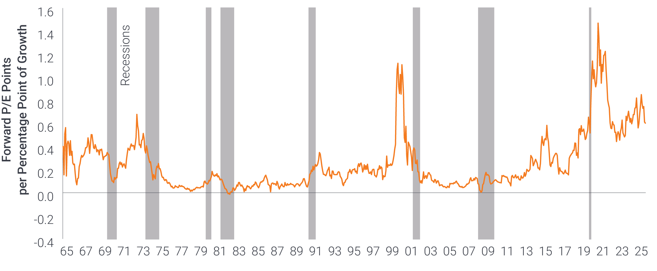 Source: National bureau of Economic Research, Empirical Research Partners Analysis, as of December 31, 2025. Note: Large capitalization stocks (excludes financials). Based on cross-sectional regression of forward P/E ratios onto trend revenue growth. Trailing P/Es are used before 1977. Trend revenue growth is five-year trailing growth rate, annualized.