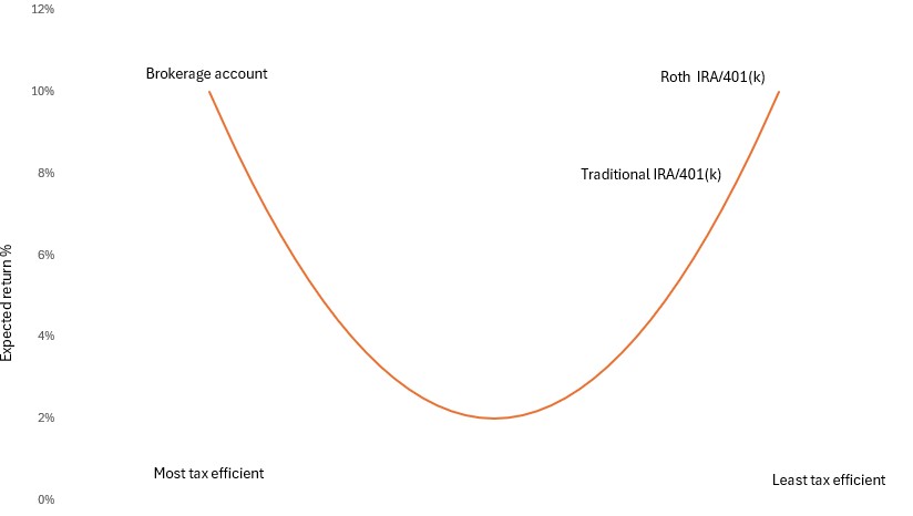 - Expected return. This is the most important factor. Investments that are expected to experience higher growth can create greater tax drag in taxable or tax-deferred accounts, resulting in larger tax bills in the future.
