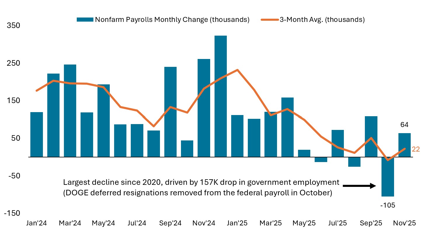 - Nonfarm payrolls fell by 105,000 in October and rose by 64,000 in November, while the unemployment rate rose to 4.6%, reflecting further softening in the labor market.