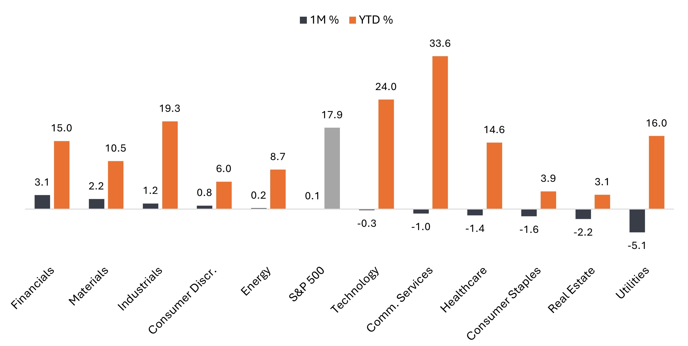 - Basic Resources (+10.3% in euro terms) led amid a rally in precious metals and copper, while Banks (+7.9%) added to strong year-to-date gains supported by lower interest rates.