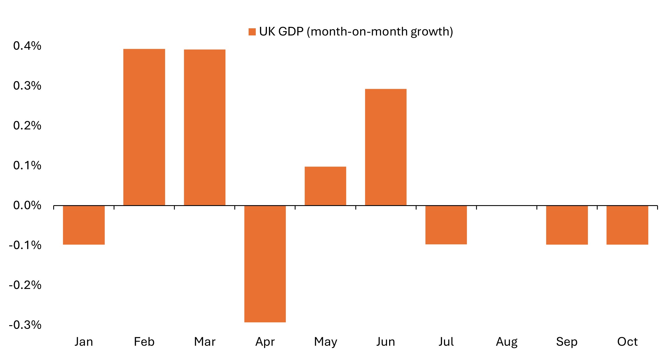- UK GDP contracted 0.1% in October, marking a second straight monthly decline and reinforcing expectations for policy easing.