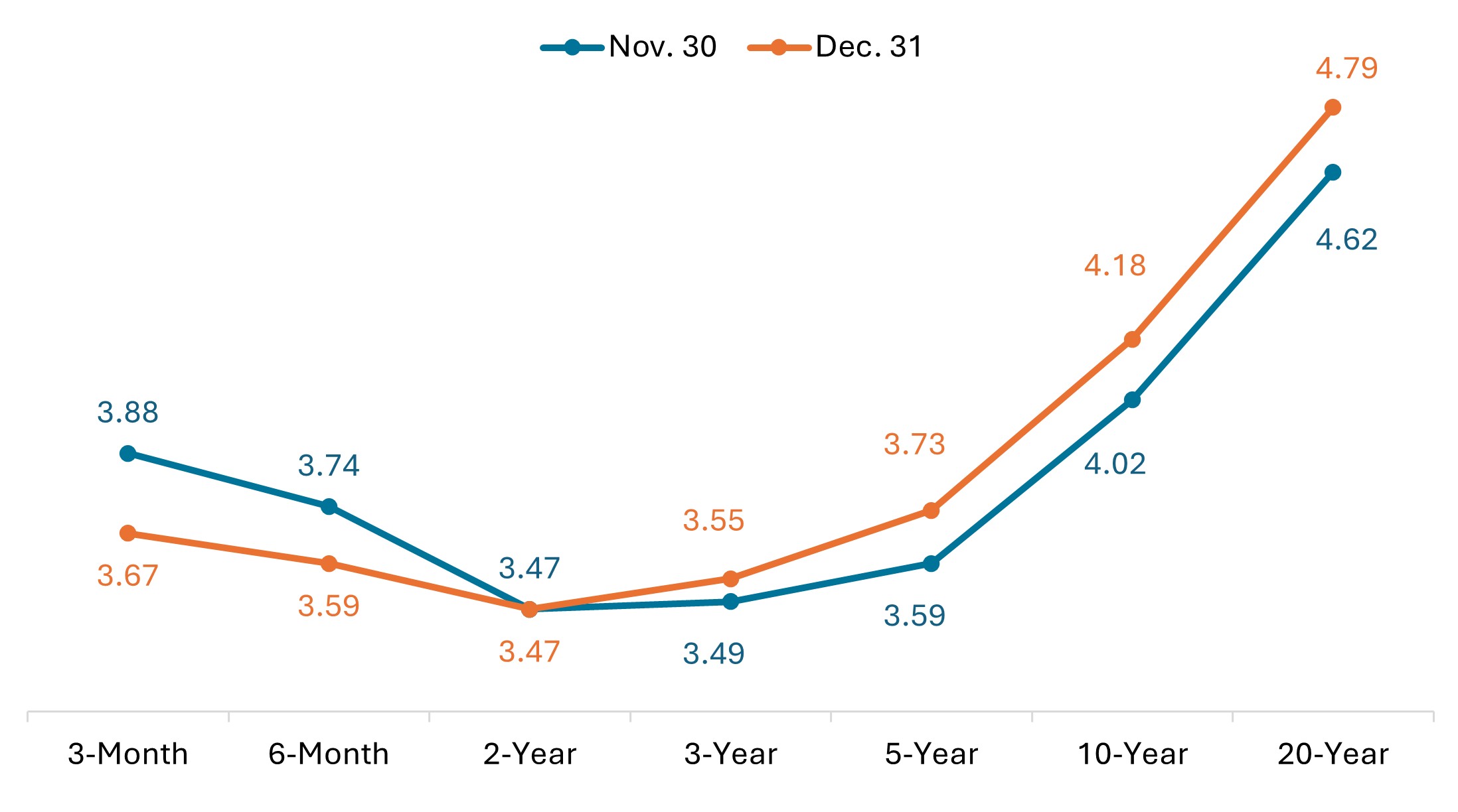 - The U.S. Treasury curve bull-steepened, with front-end rates falling in the wake of the Fed’s December 10 rate cut, while longer-dated yields rose. 10-year Treasury yields rose 16 bps but remain within the narrow range seen since August.