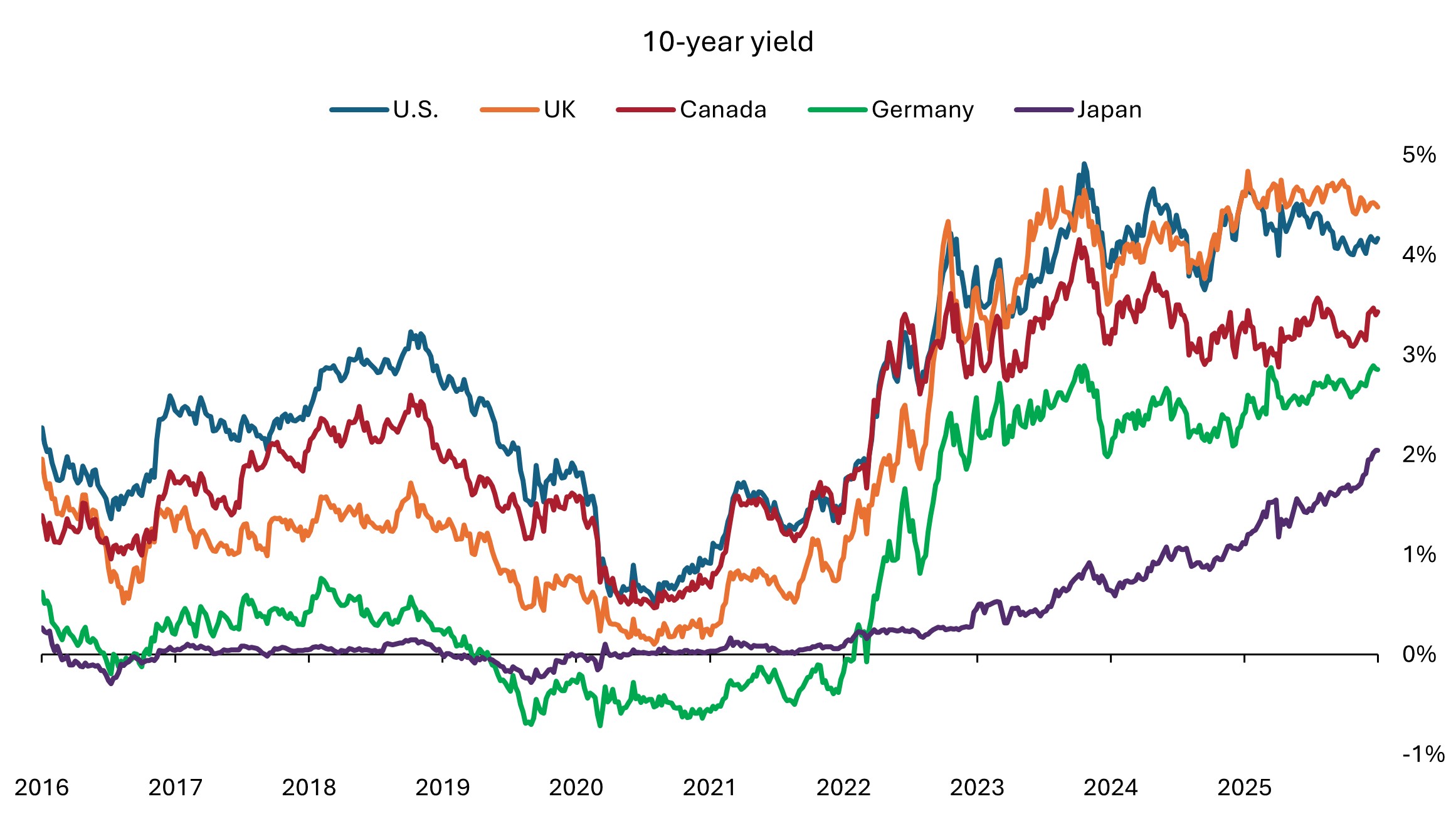 December was an extremely busy month on the monetary policy front, with a flurry of rate decisions from major central banks. Policy divergence gained traction as a prominent theme: The U.S. and UK continued on an easing path, while Europe, Canada, and Australia left rates unchanged and appear increasingly likely to remain on hold (or even hike rates) in 2026.