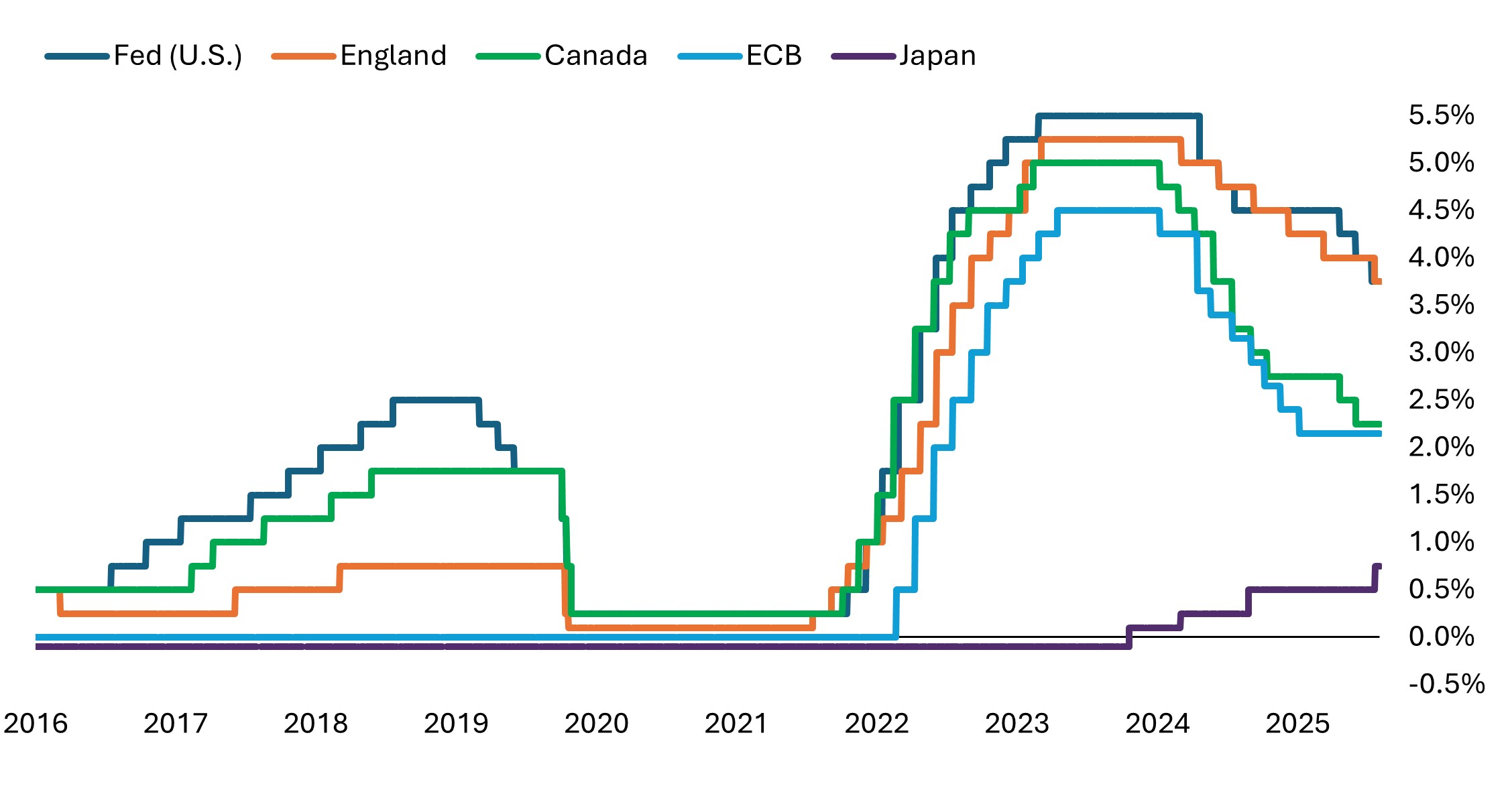 December was an extremely busy month on the monetary policy front, with a flurry of rate decisions from major central banks. Policy divergence gained traction as a prominent theme: The U.S. and UK continued on an easing path, while Europe, Canada, and Australia left rates unchanged and appear increasingly likely to remain on hold (or even hike rates) in 2026.