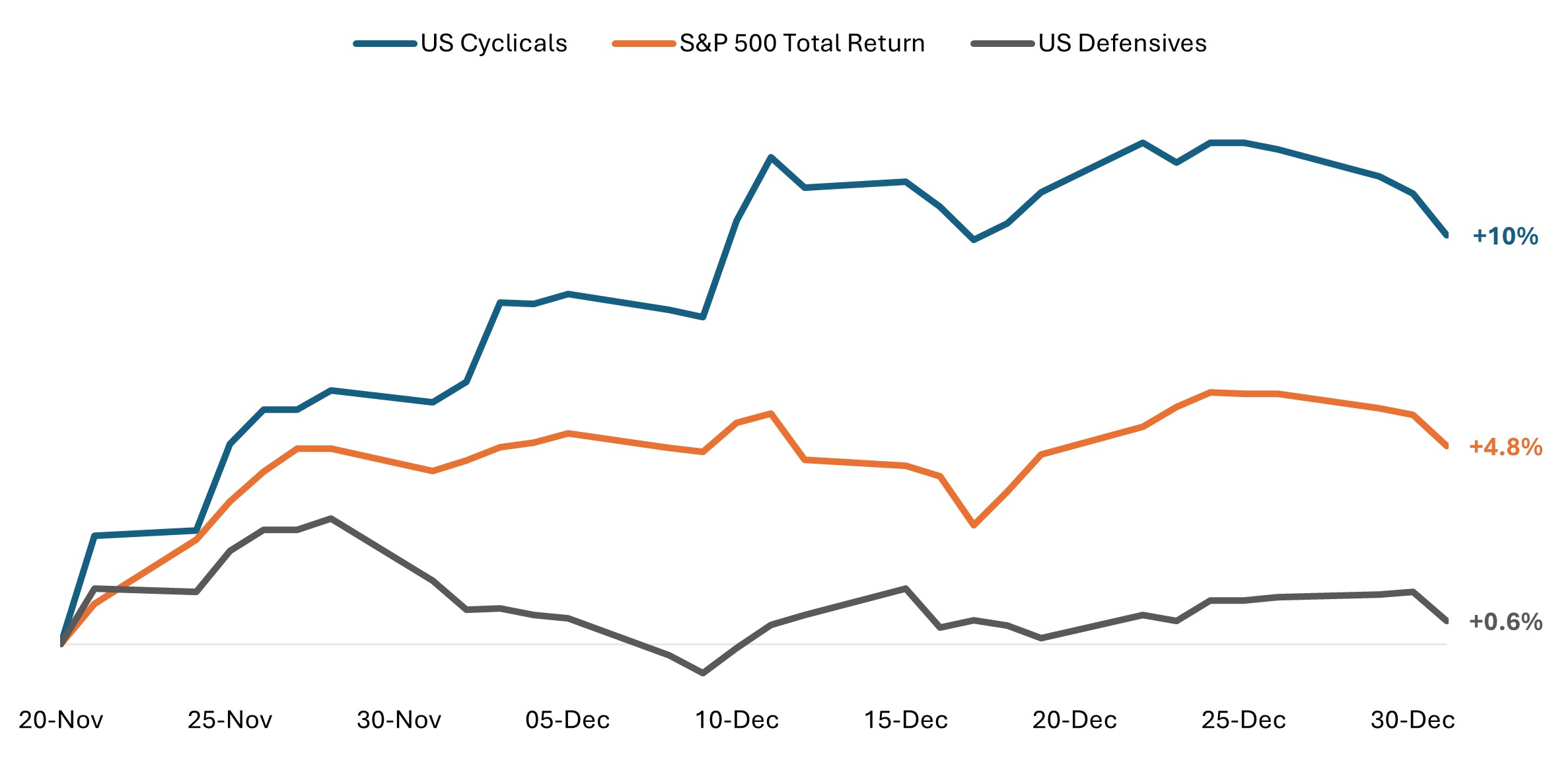 Source: Bloomberg, as of 31 December 2025. Cyclicals = Goldman Sachs US Cyclicals Index; heavily weighted toward Financials, Industrials and Consumer Discretionary. Defensives = Goldman Sachs US Defensives; heavily weighted toward Healthcare, Utilities, Staples and Real Estate.
