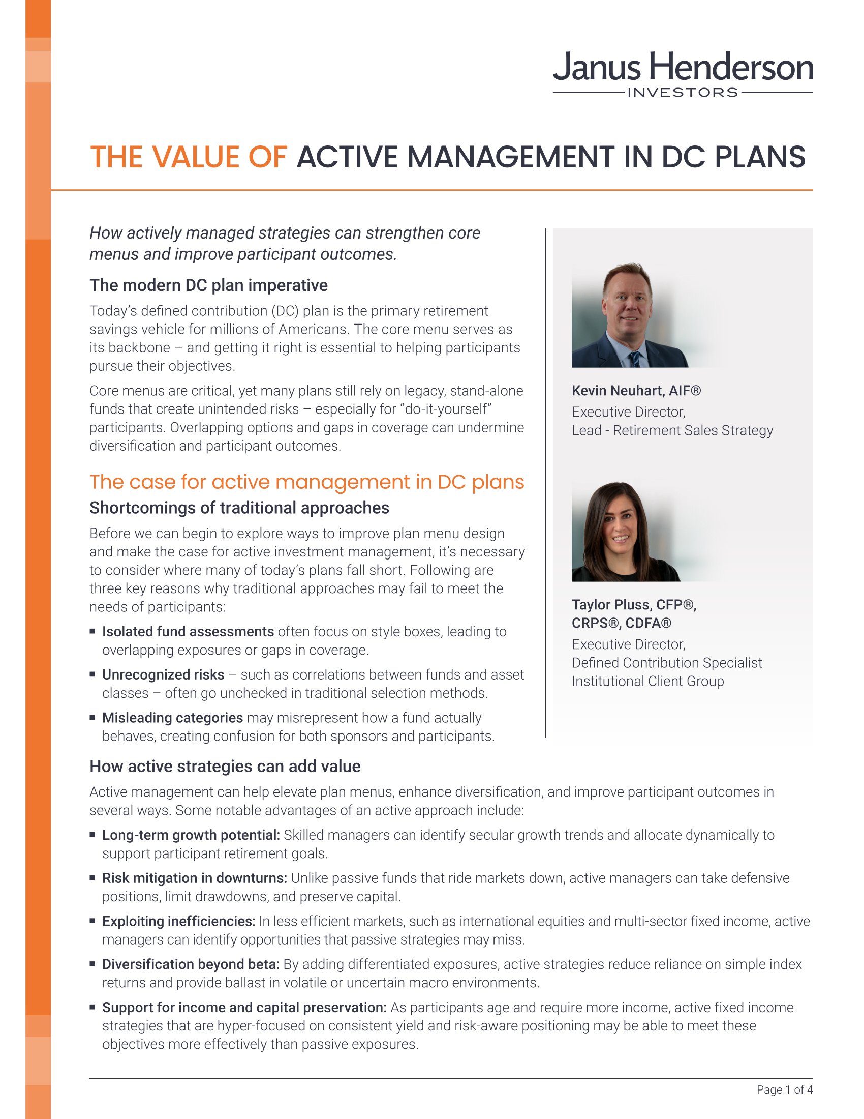 Please ensure Javascript is enabled for purposes of website accessibility The Value of Active Management in DC Plans - Janus Henderson Investors - US Advisor