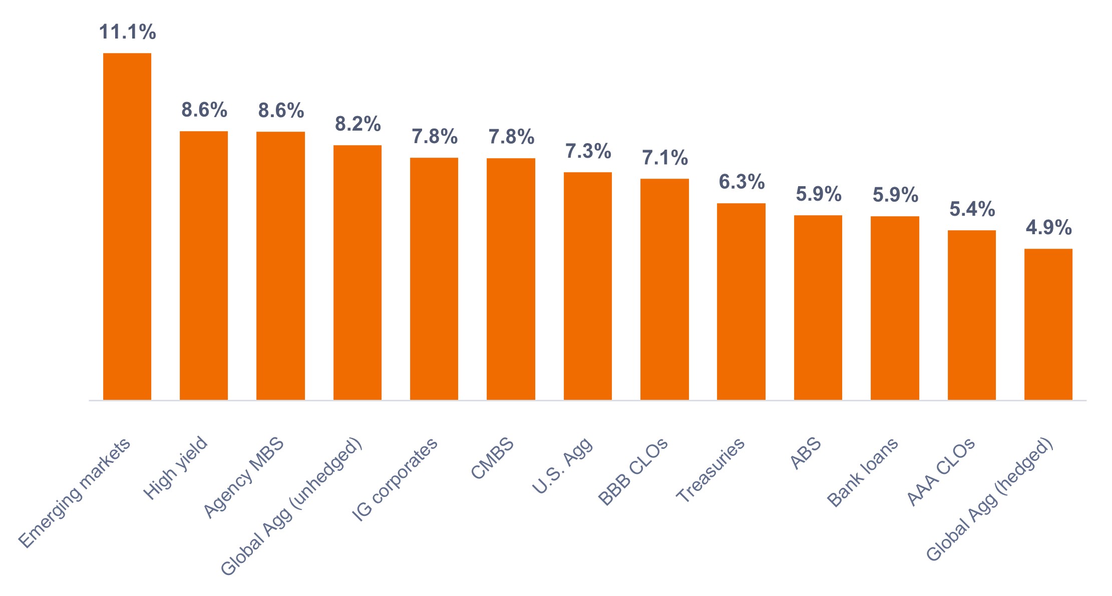 1 Emerging markets = Bloomberg Emerging Markets USD Aggregate Index, High yield = Bloomberg Corporate High Yield Bond Index, Agency MBS = Bloomberg U.S. Mortgage Backed Securities Index, Global Agg = Bloomberg Global Aggregate Bond Index, IG corporates = Bloomberg U.S. Corporate Bond Index, CMBS = Bloomberg Commercial Mortgage Backed Securities Investment Grade Index, U.S. Agg = U.S. Aggregate Bond Index, BBB CLOs = JP Morgan BBB CLO Index, Treasuries = Bloomberg U.S. Treasuries Index, ABS = Bloomberg Aggregate Asset Backed Securities Index, AAA CLOs = JP Morgan AAA CLO Index, Bank loans = Morningstar LSTA Leveraged Loan Index.