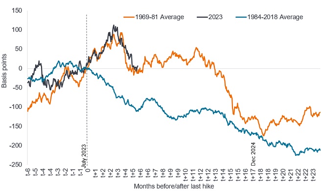 Recall that a rise in yields leads to a fall in bond prices and vice versa, so a declining line would indicate falling yields and rising bond prices. We compare this with how yields responded on average every time the Fed finished hiking rates in the 1969-81 period (characterised by rising and high inflation) and the 1984-2018 period (characterised by declining or low inflation). Overlaying the most recent 2023 episode shows that yields have followed the 1969-81 behaviour rather than 1984-2018 average.