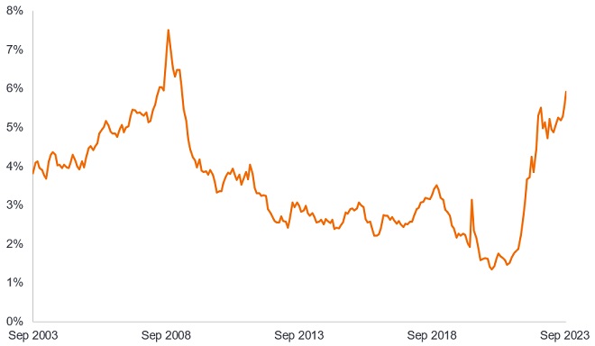 Source: Bloomberg, ICE BofA Global Corporate Index, yield to worst, 31 December 2009 to 31 August 2023. The ICE BofA Global Corporate Index tracks investment grade corporate debt publicly issued in the major domestic and Eurobond markets. Yield to worst (YTW) is the lowest yield a bond can achieve provided the issuer does not default and accounts for any applicable call feature (i.e. the issuer can call the bond back at a date specified in advance). Yields may vary over time and are not guaranteed.