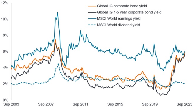 Source: Bloomberg, Earnings yield and dividend yield on MSCI World Index (equities). The MSCI World Index is an equity index that tracks the performance of large and medium-sized companies across 23 developed market countries. ICE BofA Global Corporate Index, ICE BofA 1-5 year Global Corporate Index, yield to worst, definition as for Figure 1. The ICE BofA 1-5 year Global Corporate Index is a subset of ICE BofA Global Corporate Index including all securities with a remaining term to final maturity less than 5 years. 30 September 2003 to 19 October 2023. Yields may vary over time and are not guaranteed.