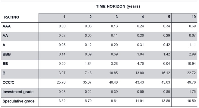 Provided a corporate bond does not default, an investor can be fairly confident of the return they will receive if a bond is held to maturity. There is always a risk, however, that a borrower could get into trouble and default and this could occur at any time. The following table demonstrates that the combination of a higher credit rating (investment grade BBB or higher) with a sub-5-year horizon has historically represented a low default incidence. Investing in lower rated bonds can bring rewards but the greater risk of default means more careful assessment of a borrower’s credit fundamentals is required, together with a more selective approach.