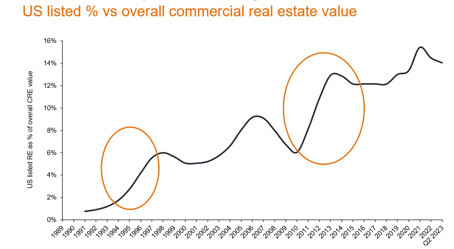 In 2023, we continued to highlight to investors that the many headlines surrounding ‘commercial real estate (CRE) in crisis’ were not entirely reflective of the reality that we see as active investors in the public REIT market. As is well-documented, the US office market is facing an extremely challenging backdrop for landlords, but forms only a small part of the REIT sector (4% of US public REITs) and one which we have avoided. Likewise, the challenges facing US regional banks, and the resulting reduction of debt availability, will present greater challenges in the private rather than the public real estate markets in which we invest. For the latter, leverage levels are historically low and companies have continued to demonstrate their ability to access both debt and equity on still accretive terms.