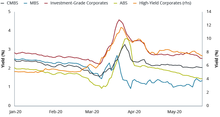 Source: Bloomberg, as of 30 April 2020. CMBS: Bloomberg Barclays U.S. Commercial Mortgage Backed Securities Index. MBS: Bloomberg Barclays U.S. MBS Index. Investment-Grade Corporates: Bloomberg Barclays U.S. Corporate Bond Index. ABS: Bloomberg Barclays U.S. Aggregate Asset Backed Securities Index. High-Yield Corporates: Bloomberg Barclays U.S. Corporate High Yield Bond Index.