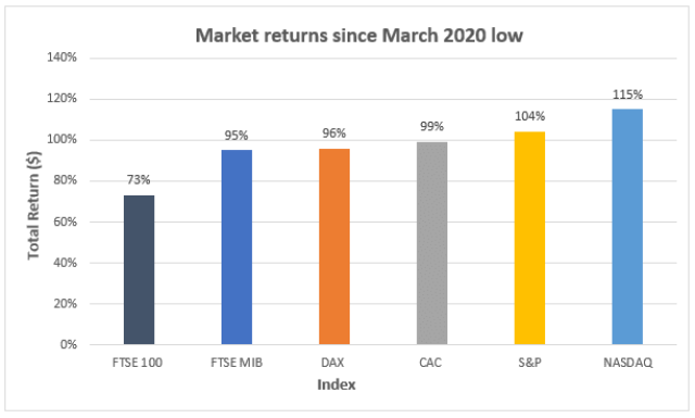 So, what can the average investor take away from the chaos of 2020/1 as we look forward to a new year? Well, it’s hard to argue that in such extreme circumstances having a globally diversified portfolio would totally have shielded you from the volatility we saw at the beginning of 2020. However, what is also true, is that some countries have bounced back better than others. For example, in the UK, the FTSE 100 went from 7,674 on 3rd March 2020 to 4,994 just 20 days later – a fall of 36%. Since that low, the FTSE 100 has gone up by 73%, which sounds healthy until you compare the rebound in other countries – Italy and Germany are up over 95%, whilst France is closer to 100%. In the US, the numbers are staggering: the S&P 500 has grown 104% since its low in March 2020, and the NASDAQ is up a whopping 115%.