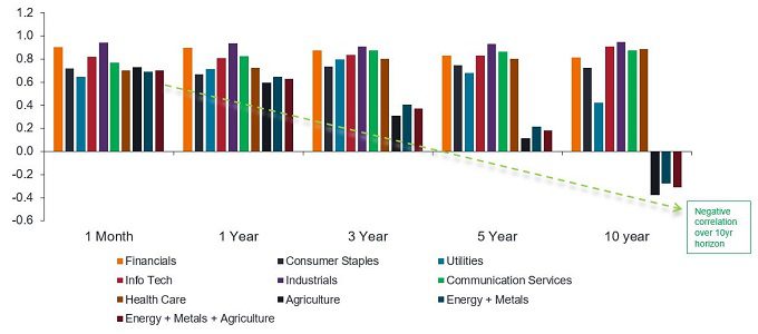 Source: Bloomberg, FactSet, Janus Henderson Investors. Correlation of resources (energy + mining + agriculture) to other MSCI World Index sectors, monthly observations from February 1995 to February 2022. Past performance does not predict future returns.