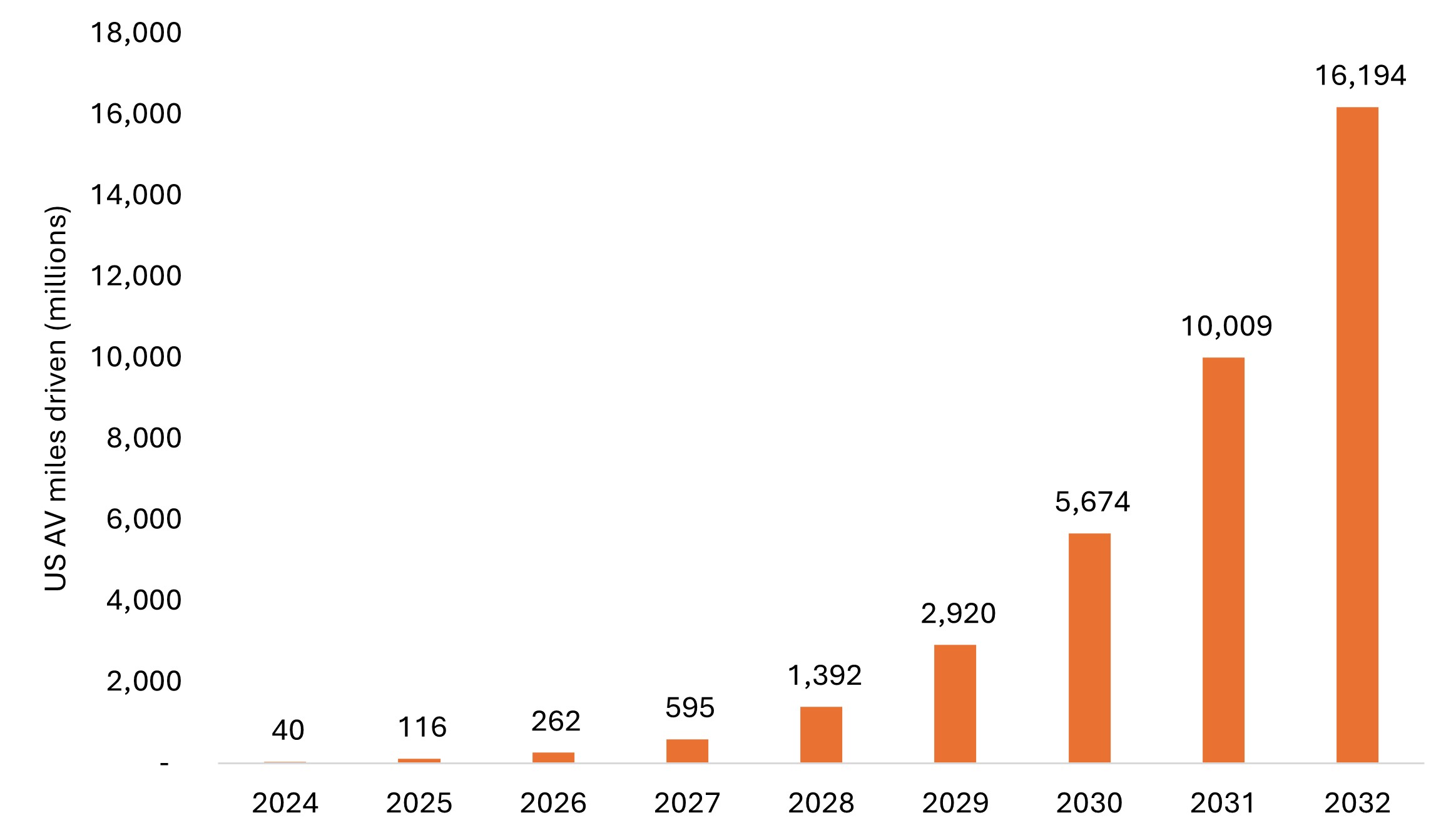 Exhibit 1: According to estimates, U.S. autonomous vehicle miles driven could achieve an annual growth rate of 103% from 2025 to 2032.