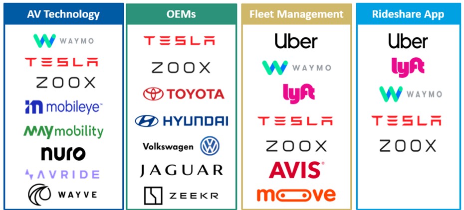 • There is uncertainty around whether ridesharing platforms become essential partners or face potential disintermediation. The long-term optimistic case is that these platforms run efficient hybrid networks that prevent any single AV provider from dominating the market.