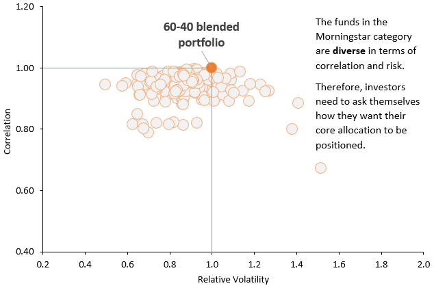 5-year correlation and relative volatility of funds in the Morningstar USD Moderate Allocation category versus a 60/40 blended-index portfolio.