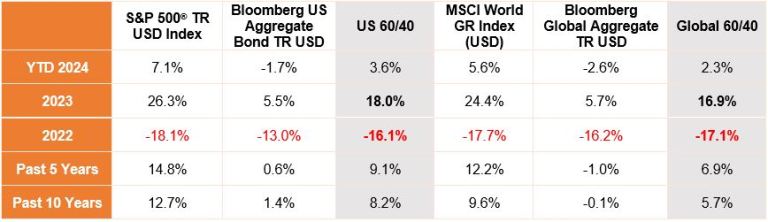 Source: Morningstar & Janus Henderson Portfolio Construction and Strategy Team. As of 29 February 2024. US 60/40 = a hypothetical portfolio invested 60% in the S&P 500 TR USD Index and 40% in the Bloomberg US Aggregate Bond TR USD Index. Global 60/40 = a hypothetical portfolio invested 60% in the MSCI World Gross Index (USD) and 40% in the Bloomberg Global Aggregate Bond TR USD Index. Past performance does not predict future returns.