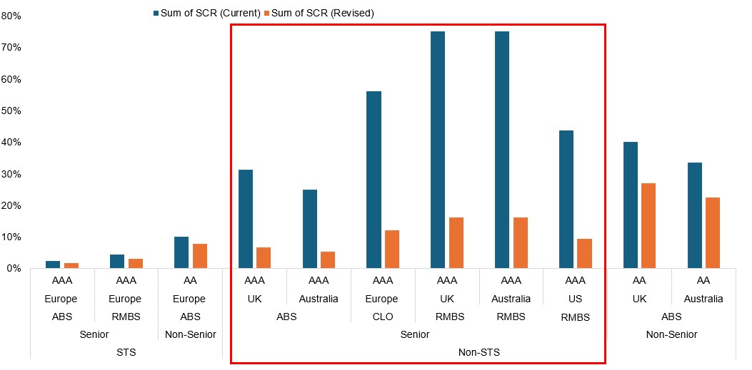 Figuur 2 toont specifieke, schaalbare en liquide gesecuritiseerd activaklassen die gepositioneerd zijn om aanzienlijk te profiteren van de komende veranderingen. De huidige SCR wordt weergegeven in blauw, terwijl de herziene SCR wordt weergegeven in oranje. De meest significante verandering is zichtbaar in de senior (AAA) tranches van niet-STS-transacties in UK en Australian ABS, Europese CLO's, evenals Britse, Amerikaanse en Australische RMBS.