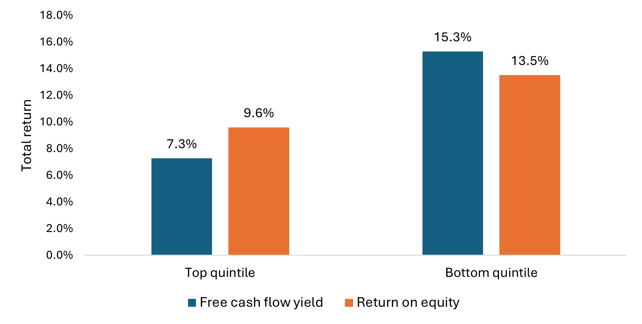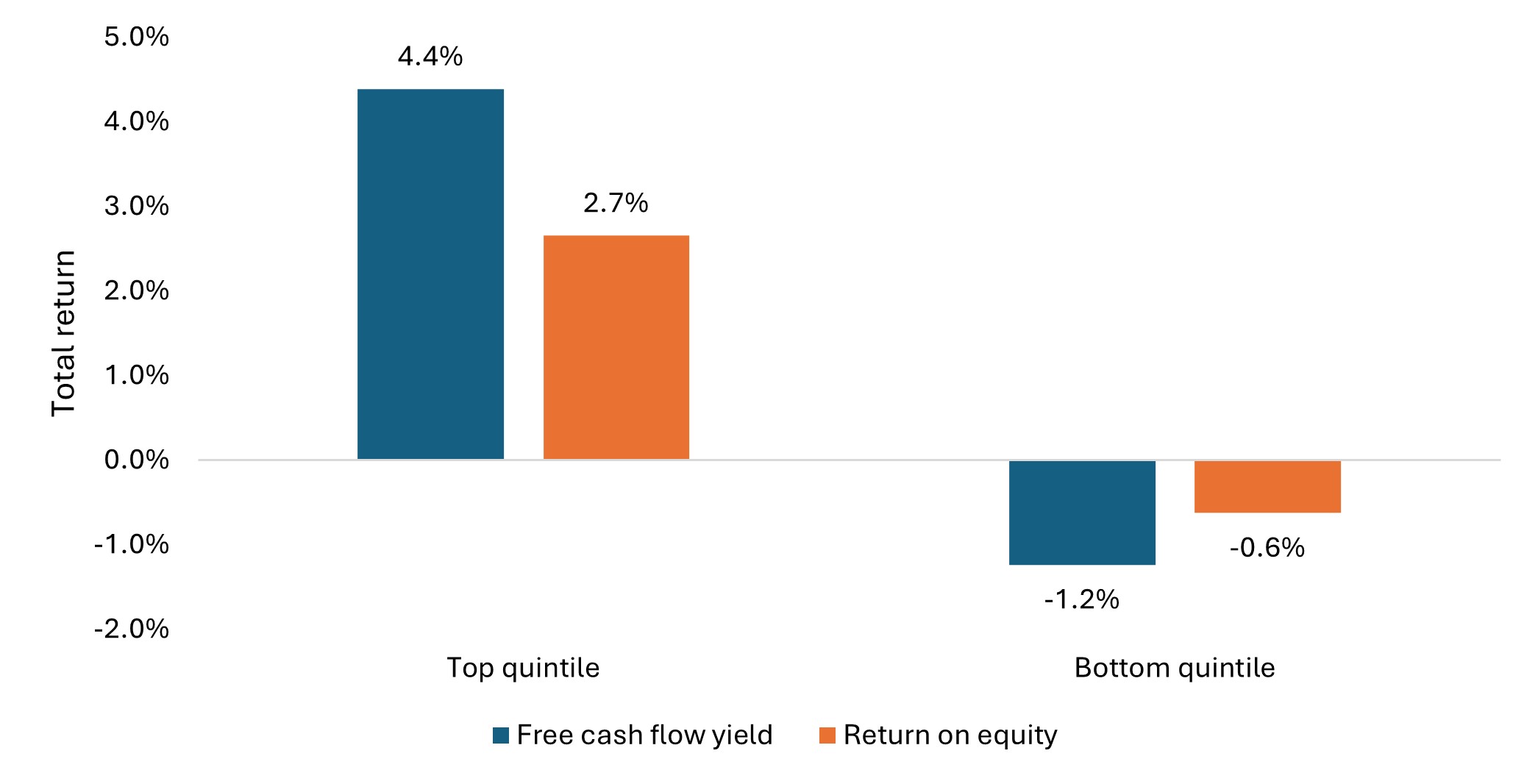 Another measure of quality – free cash flow yield – has historically been a strong indicator of value, and investors have typically been well rewarded for focusing on it. Over the past 20 years, the top quintile by free cash flow yield outperformed the bottom quintile by 5.62% per quarter on average, and the top quintile by ROE outperformed the bottom quintile by 3.28% per quarter (Exhibit 2).