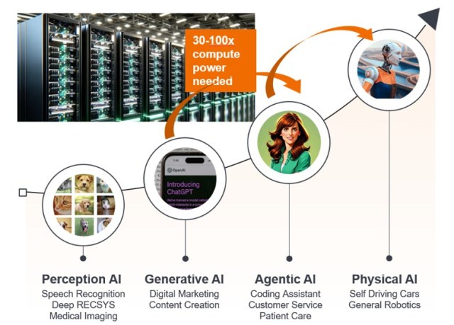 物理AI:將複雜的AI算法整合入有形的交互式系統,使具備認知推理及空間感知能力的自主機器,能夠從與外界的交互中學習並作出實時反應。例如:自動駕駛汽車、手術機械人及人形機械人。